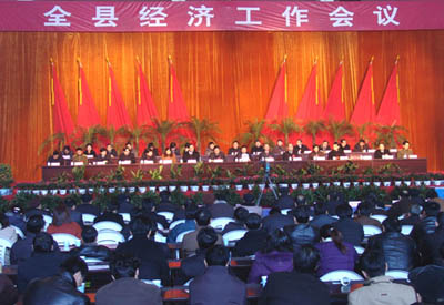 2006年2月10日上午,全縣經(jīng)濟(jì)工作會議在縣體育館隆重召開。這次全縣經(jīng)濟(jì)工作會議的主要任務(wù)是,全面貫徹落實中央和省、市經(jīng)濟(jì)工作會議和縣委十屆七次全體(擴(kuò)大)會議精神,認(rèn)真總結(jié)了2005年經(jīng)濟(jì)工作,表彰了各項先進(jìn),全面部署了2006年各項目標(biāo)任務(wù),進(jìn)一步統(tǒng)一全縣上下的思想認(rèn)識,搶抓機(jī)遇,扎實若干,努力實現(xiàn)全縣經(jīng)濟(jì)又快又好地發(fā)展,構(gòu)建和諧當(dāng)涂,為順利實施“十一五”規(guī)劃開好局、起好步。縣長操隆山作了全縣經(jīng)濟(jì)工作報告,縣委書記毛長江發(fā)表了重要講話。縣委、縣人大、縣政府、縣政協(xié)、縣紀(jì)委、縣人武部負(fù)責(zé)同志,縣委委員、候補(bǔ)委員,縣紀(jì)委委員,縣人大常委、政協(xié)常委,曾擔(dān)任縣級實職的離退休老干部,各工委書記,各鄉(xiāng)鎮(zhèn)黨委書記、人大主席,鄉(xiāng)鎮(zhèn)長和文書,各村(居委員)總支(支部)書記、主任和縣直各部、委、局、辦負(fù)責(zé)人、部分機(jī)關(guān)干部代表等共計2000多名干部職工參加了會議。
