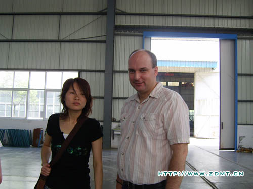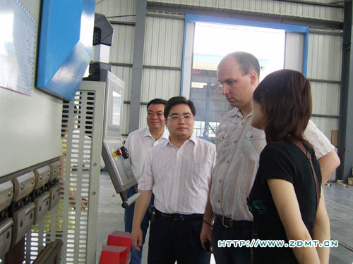 在中德公司領導的陪同下,尼爾森先生來到了我們的車間。尼爾森先生尤其關注數控類機床,對數控機床成品都一一細細查看。在正在生產中的大型數控雙機聯動折彎機前,尼爾森表現出了極大的興趣,認真的向負責人了解機器的情況。在大型裝配車間,尼爾森一行對中德車間的管理布局及環境表示了贊揚,雖然天氣很熱,干凈整潔的車間環境讓他們輕松地進行參觀。另外,負責人還向他們介紹了產品設計方面的一些小細節如夾塊、T型槽等等,這些細節體現出了中德產品使客戶在使用產品過程中將會得到極大的便利。