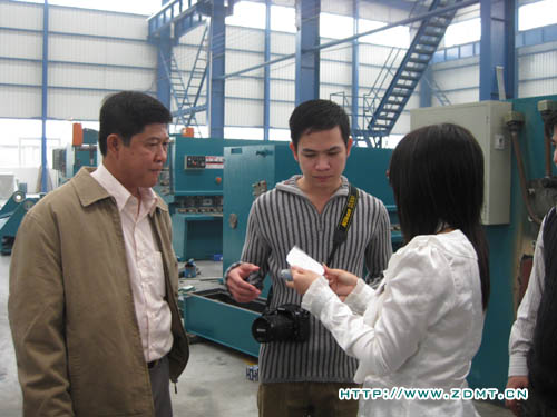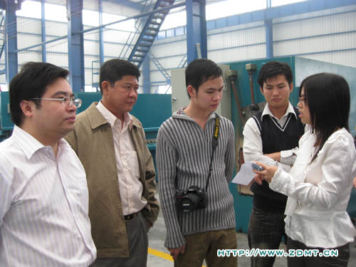 KONG KHEANG先生已經跟我們通過網絡和電話聯系了近一個月,對中德機床表現了強烈的購買需求。此次專程拜訪中德,正是為了洽談有關雙機事宜,順便實地考察。KONG KHEANG先生從事板料加工多年,對機器的操作是輕車熟路,目前自己的工廠里也有幾臺被撕去標牌的中國機床。這一次,實實在在的看到中德的機床以后,光光是機身油漆的光潔,整體的外觀,就使他很激動,親自體驗了一下我們一臺正在調試的折彎機,然后心滿意足的笑了。