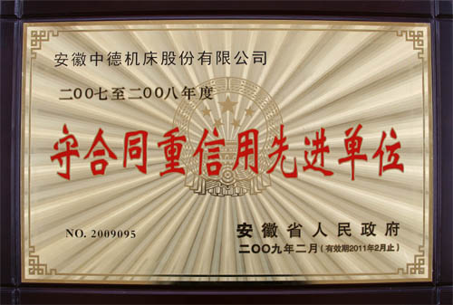 近日,我公司榮獲由安徽省人民政府頒發的二〇〇七至二〇〇八年度“守合同重信用先進單位”榮譽稱號(證書號:2009095,有效期止2011年2月),也是我公司第二次獲得此項殊榮。